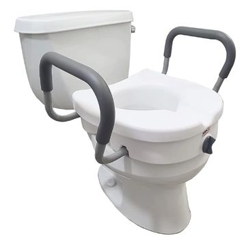 A seat riser with arms raises the height of the toilet and provides sturdy armrests to assist seniors when sitting down and standing up. It reduces strain on the joints and improves stability, helping prevent falls and support independent toileting.