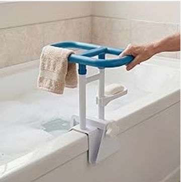 A clamp-on tub rail provides a secure handhold for seniors when entering and exiting the tub, reducing the risk of slips and falls. It adds stability and confidence during bathing without requiring permanent installation.